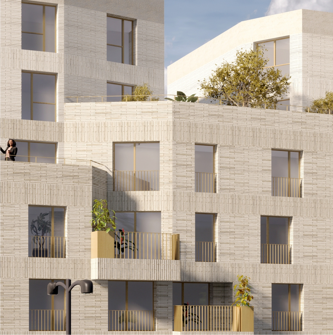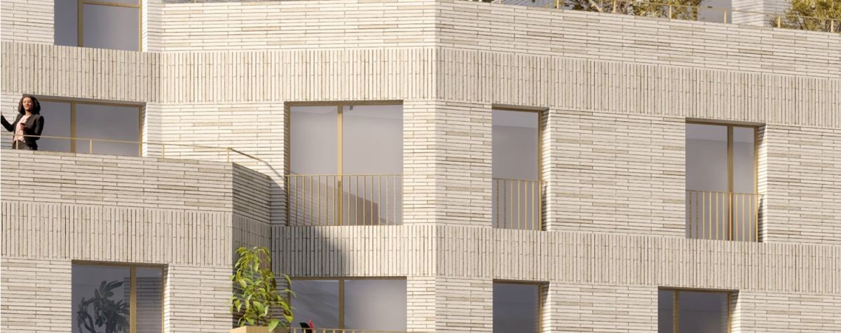 Le calepinage rigoureux des façades en briquette de ciment souligne le travail plastique des volumes alternant saillies et creusements, renforçant la prééminence des horizontales. Les menuiseries extérieures et ouvrages en serrurerie thermolaqués ton bronze contrastent avec la minéralité de la briquette mate et offriront des détails soignés et pérennes.