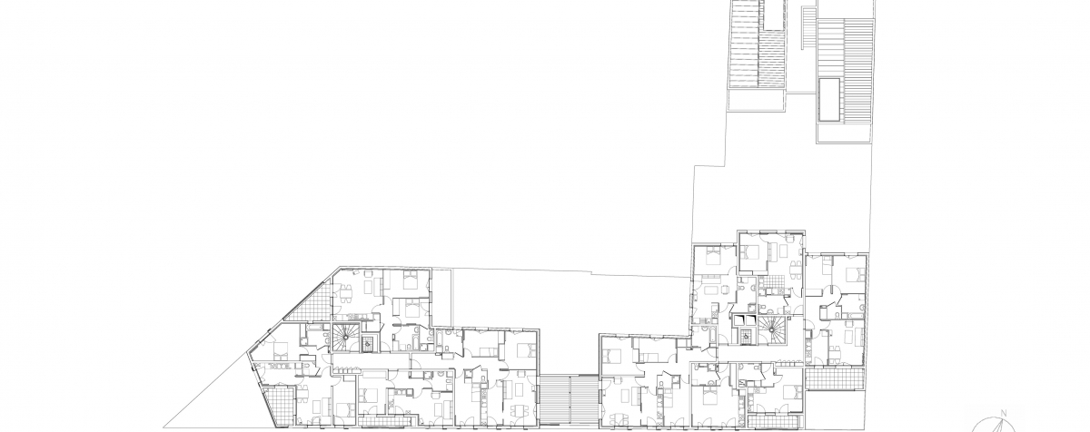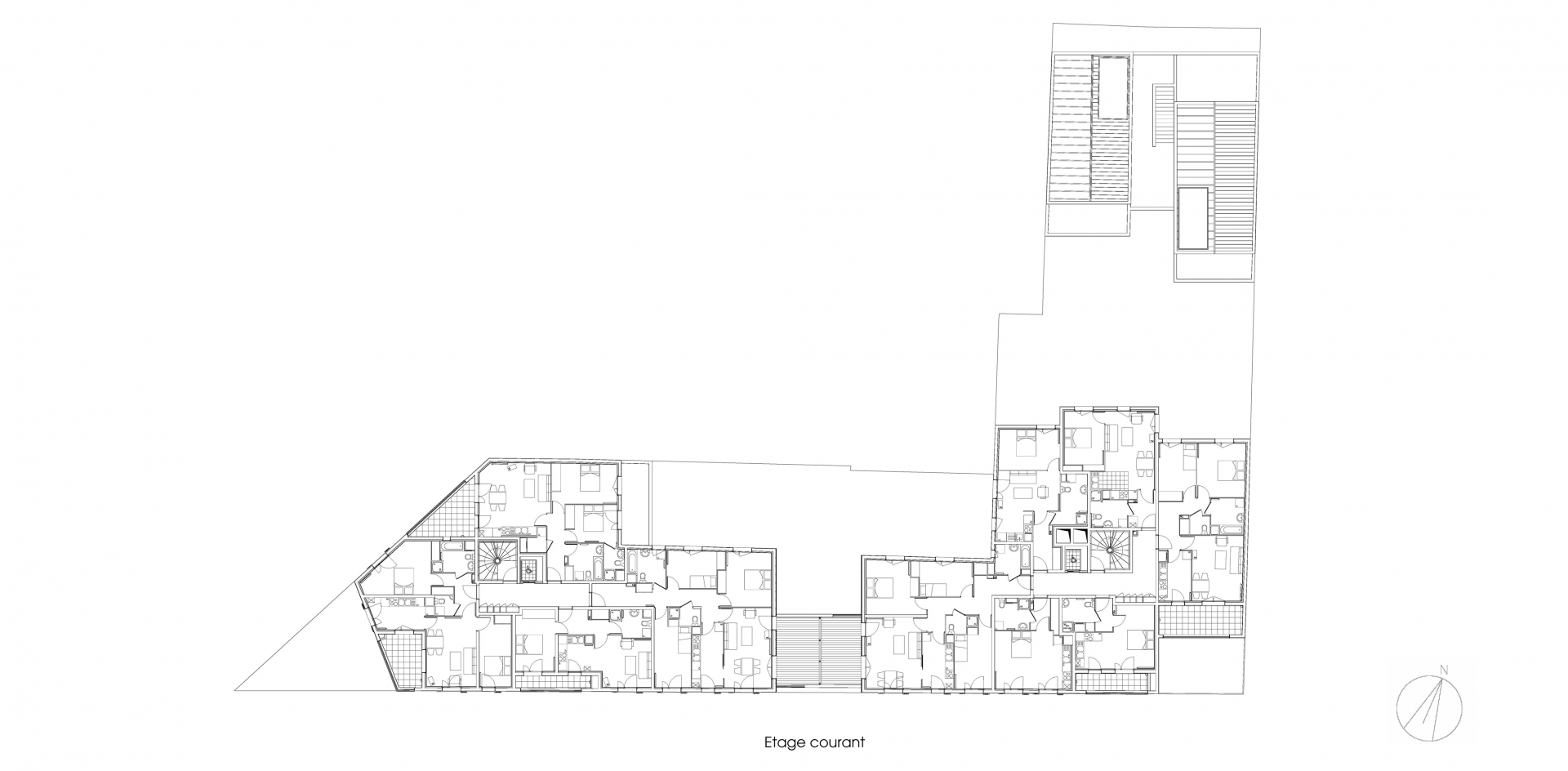 Le projet est composé de deux immeubles et de deux petites constructions accolées. Les deux immeubles sont constitués d'un soubassement R+3 respectant l'alignement de la rue ainsi qu'un couronnement de deux niveaux en retrait assurant d'une part la continuité du front bâti et d'autre part la transition avec un habitat plus pavillonnaire en cœur d'îlot. Le bâtiment constitué de deux maisons accolées en R+2 s'adapte au contexte en s'alignant aux pignons existants de part et d'autre du terrain. L'ensemble de ces constructions représente 46 logements. L'ensemble des logements est agrémenté d'un jardin privatif, d’une terrasse ou d’une loggia.