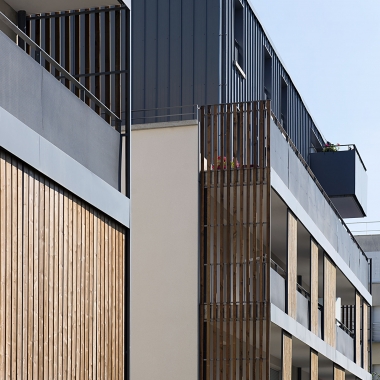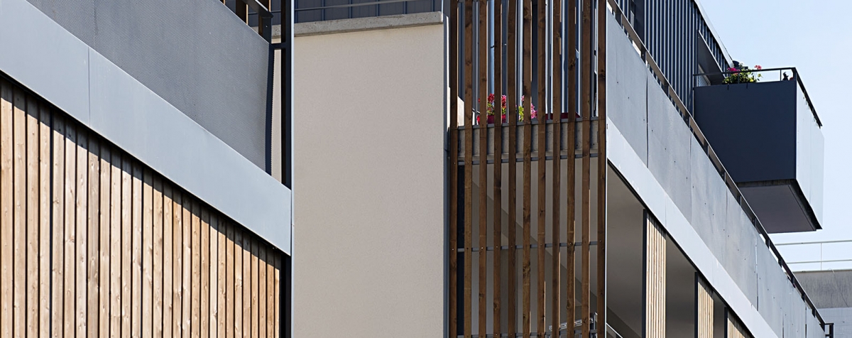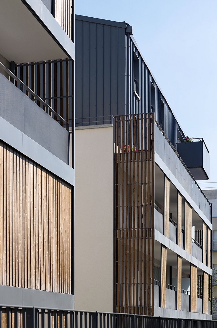 Les façades sont revêtues de plusieurs matériaux qui répondent à la composition en volumes et participent à créer une échelle intermédiaire de grosses maisons en attique posées sur un socle de deux ou trois étages. En attique le bois et l’acier laqué revêtent les façades. Les socles des bâtiments sont revêtus d’un enduit blanc. Le rez-de-chaussé est partiellement revêtu de brique grise.