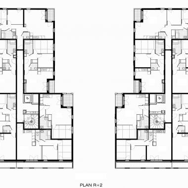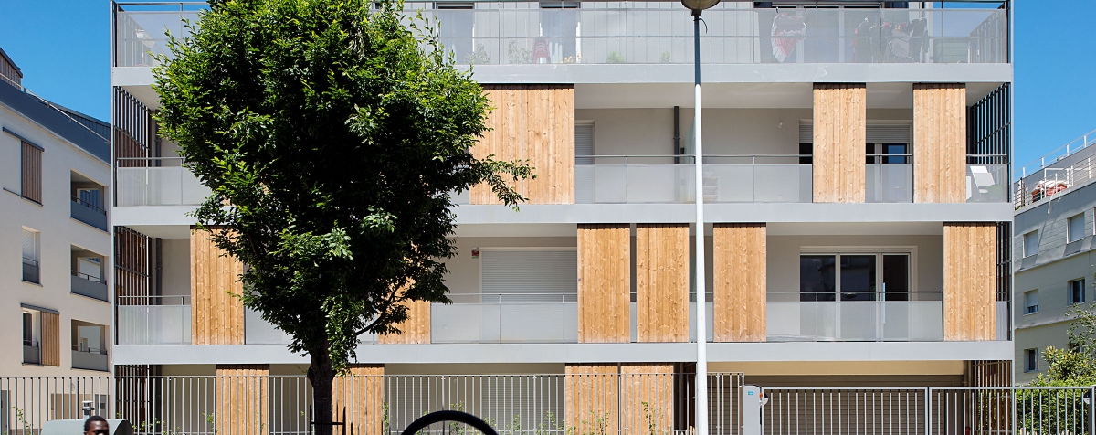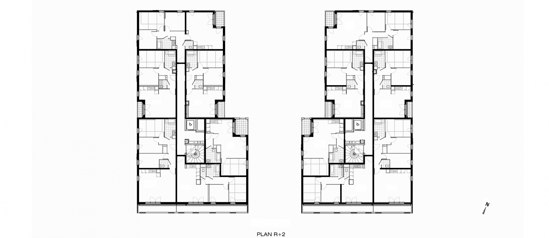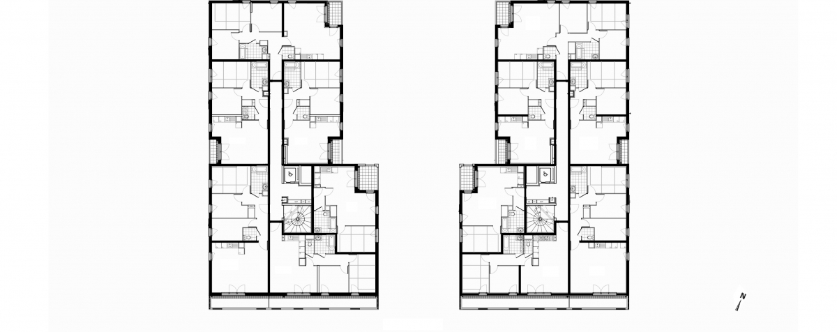 Les 60 logements collectifs sont répartis en deux bâtiments de quatre étages sur rez-de-chaussée. Ils présentent une symétrie en plan autour d’un espace central.