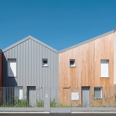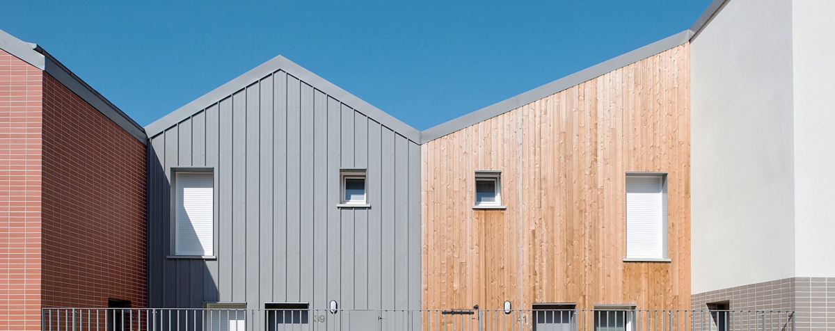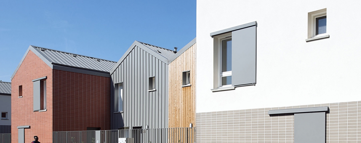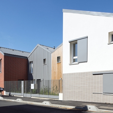 L’implantation des maisons se fait en quinconce. Des jardins privatifs s’organisent à l’arrière de chaque maison. Elles sont revêtues de plusieurs matériaux qui répondent à la composition en volume et participent à créer une échelle individualisée des maisons : de l’enduit blanc lisse en façade arrière des maisons, de la brique grise et ton orangé, du bardage bois et du bardage métallique en acier laqué.