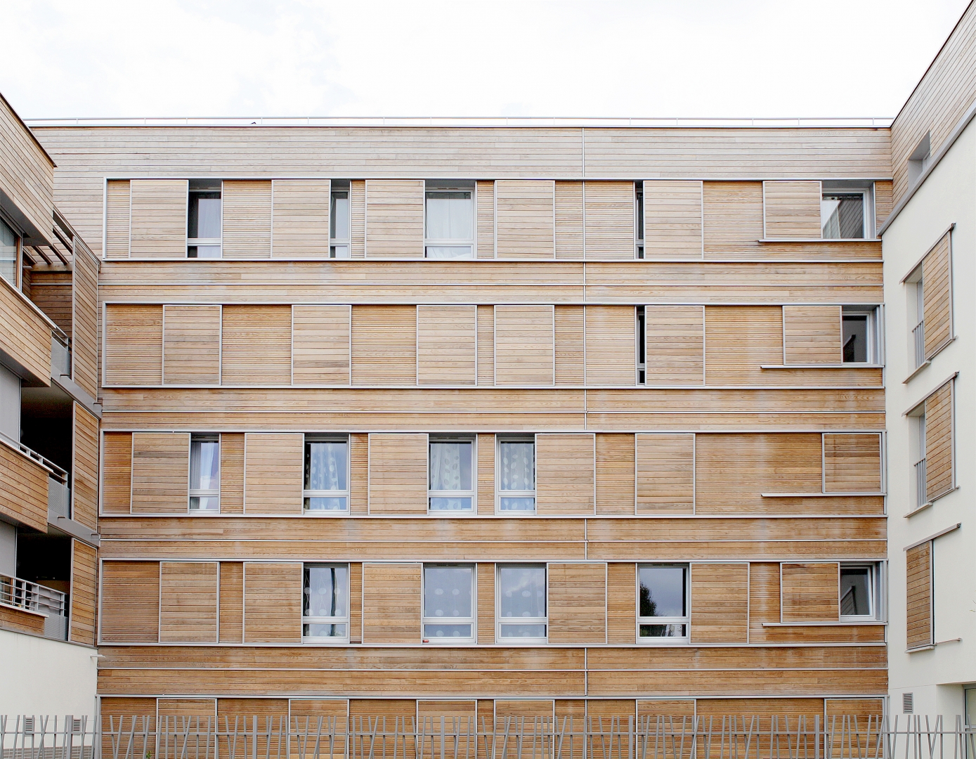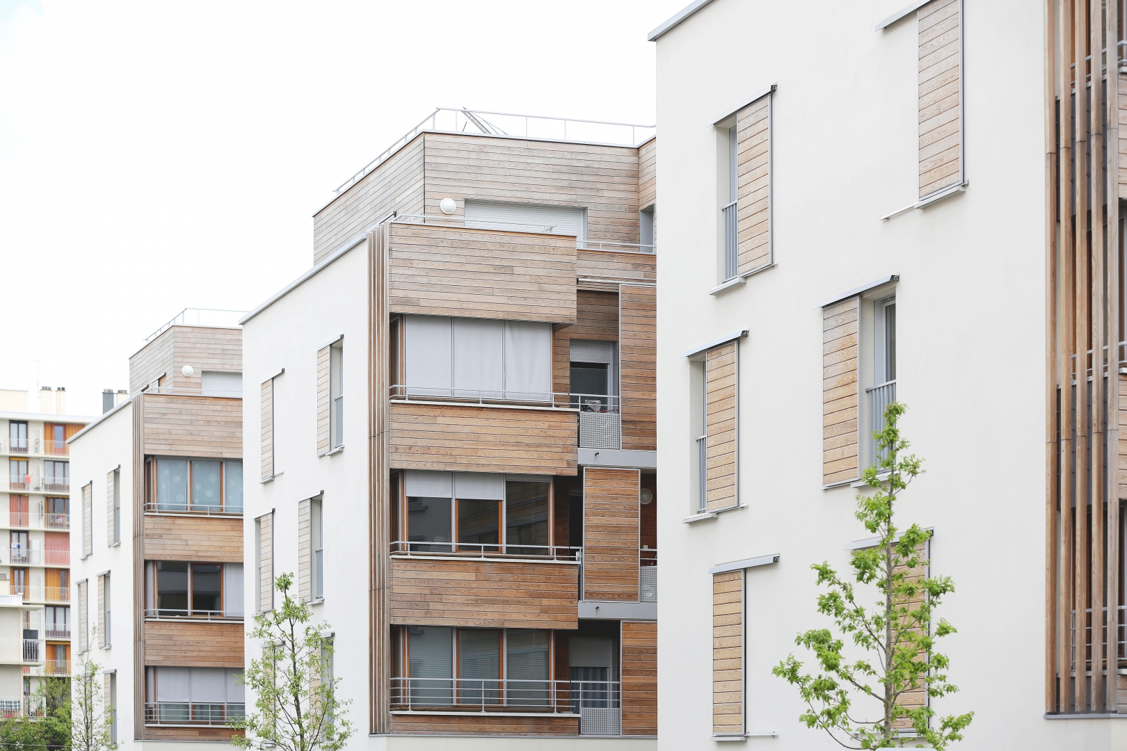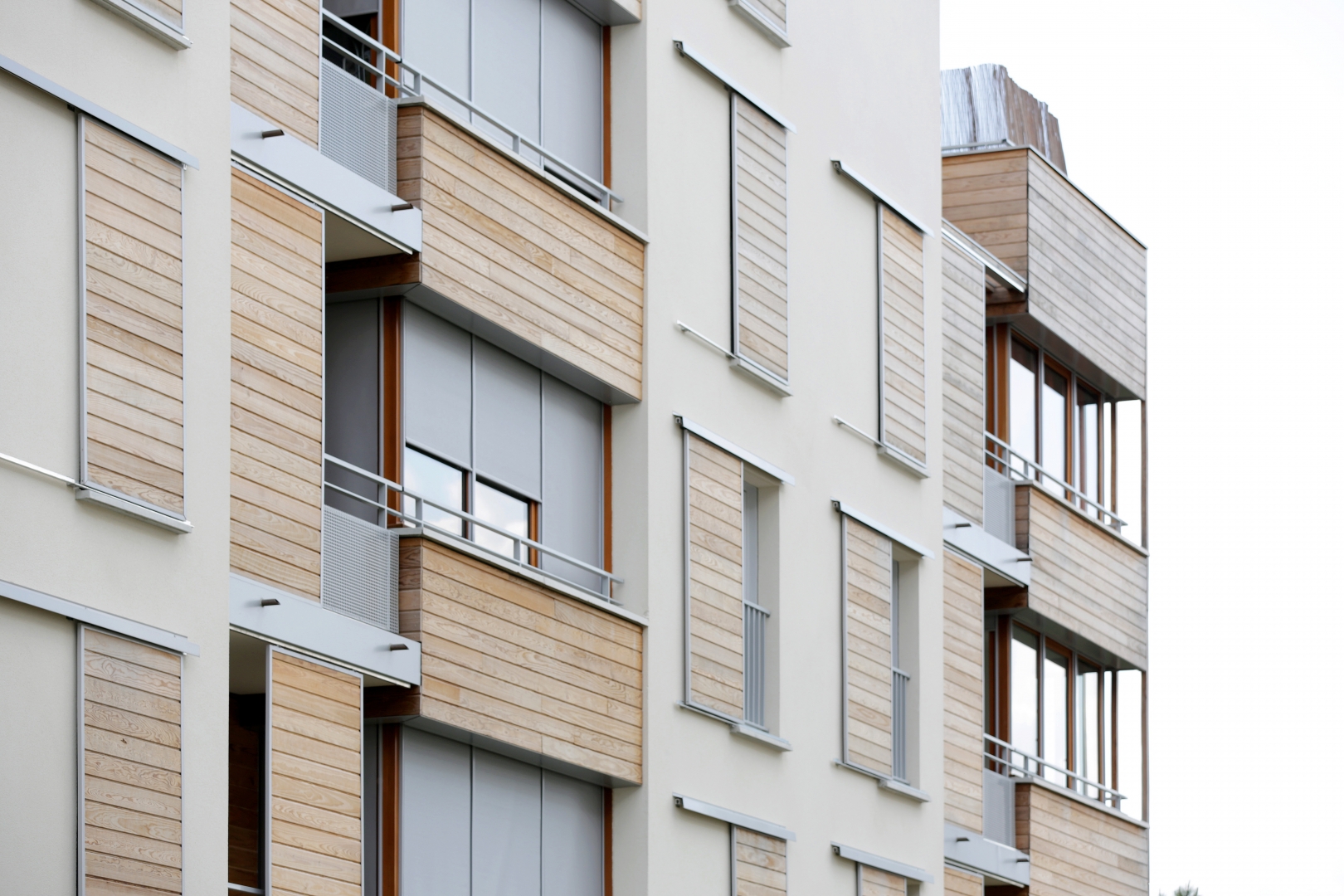 Le système constructif « bois » est la mise au point d’un complexe de vêtures et de panneaux isolants qui forme une enveloppe indépendante de la structure, imperméable à l’air et énergétiquement protectrice et étanche à la circulation de l’air. La ventilation est assurée mécaniquement et naturellement par la pluri-orientation des logements. Des occultations par stores en toile sont disposés sur les larges baies vitrées exposées au sud-ouest, afin d’optimiser les performances de confort d’été.