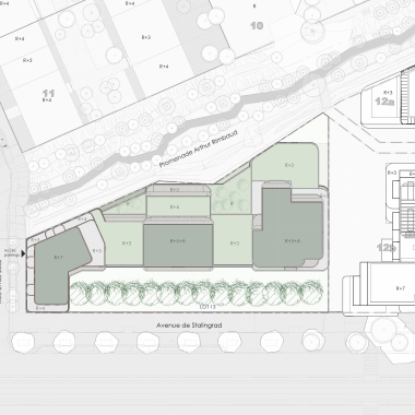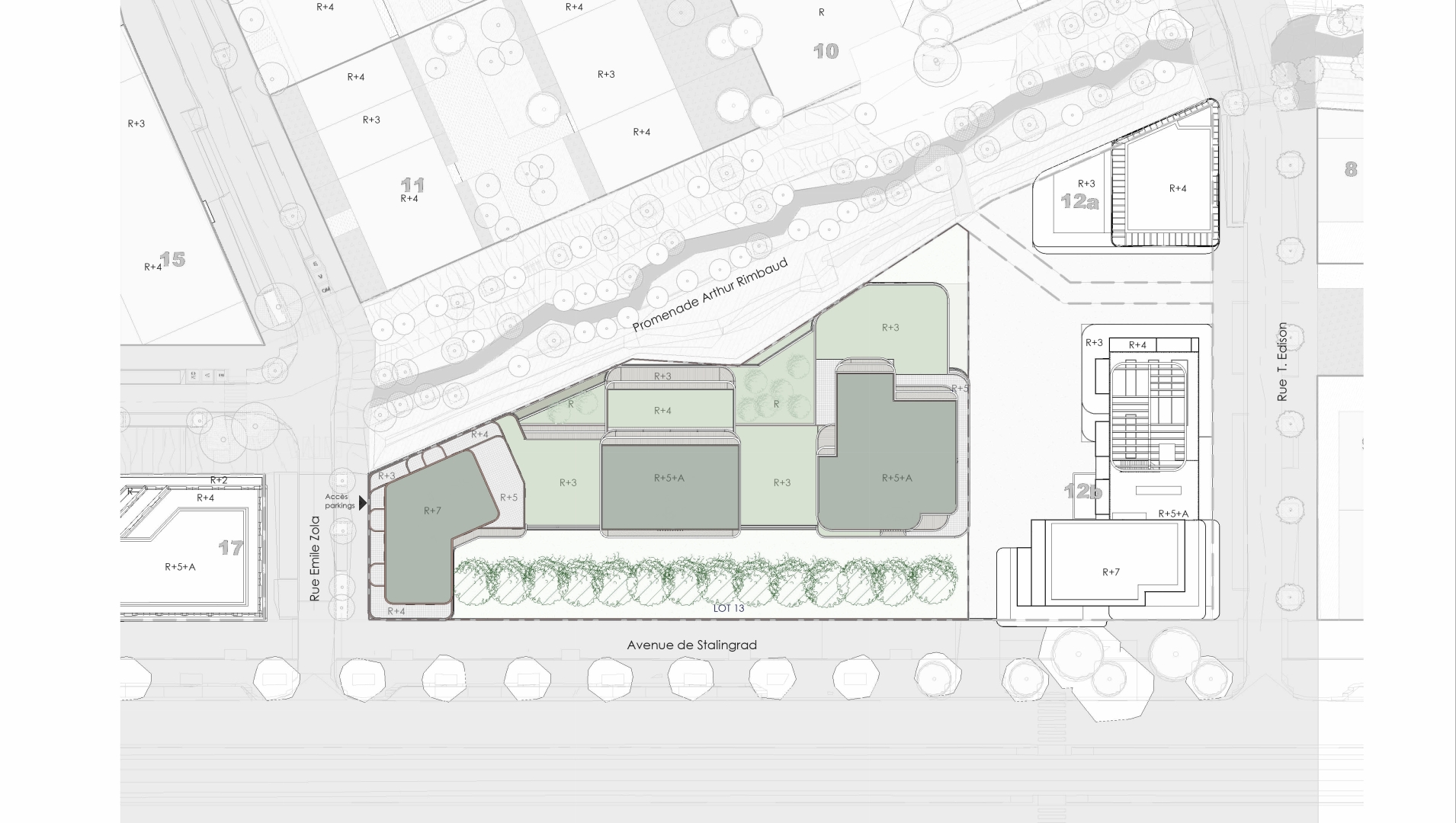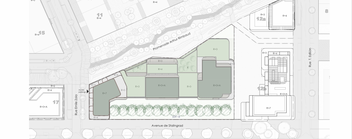 Situé au coeur du nouveau quartier de la ZAC Anatole France, le lot n°13 participe à l’élaboration de l’ambiance apaisée et paysagère souhaitée en lien avec la promenade plantée de la rue A. Rimbaud.
